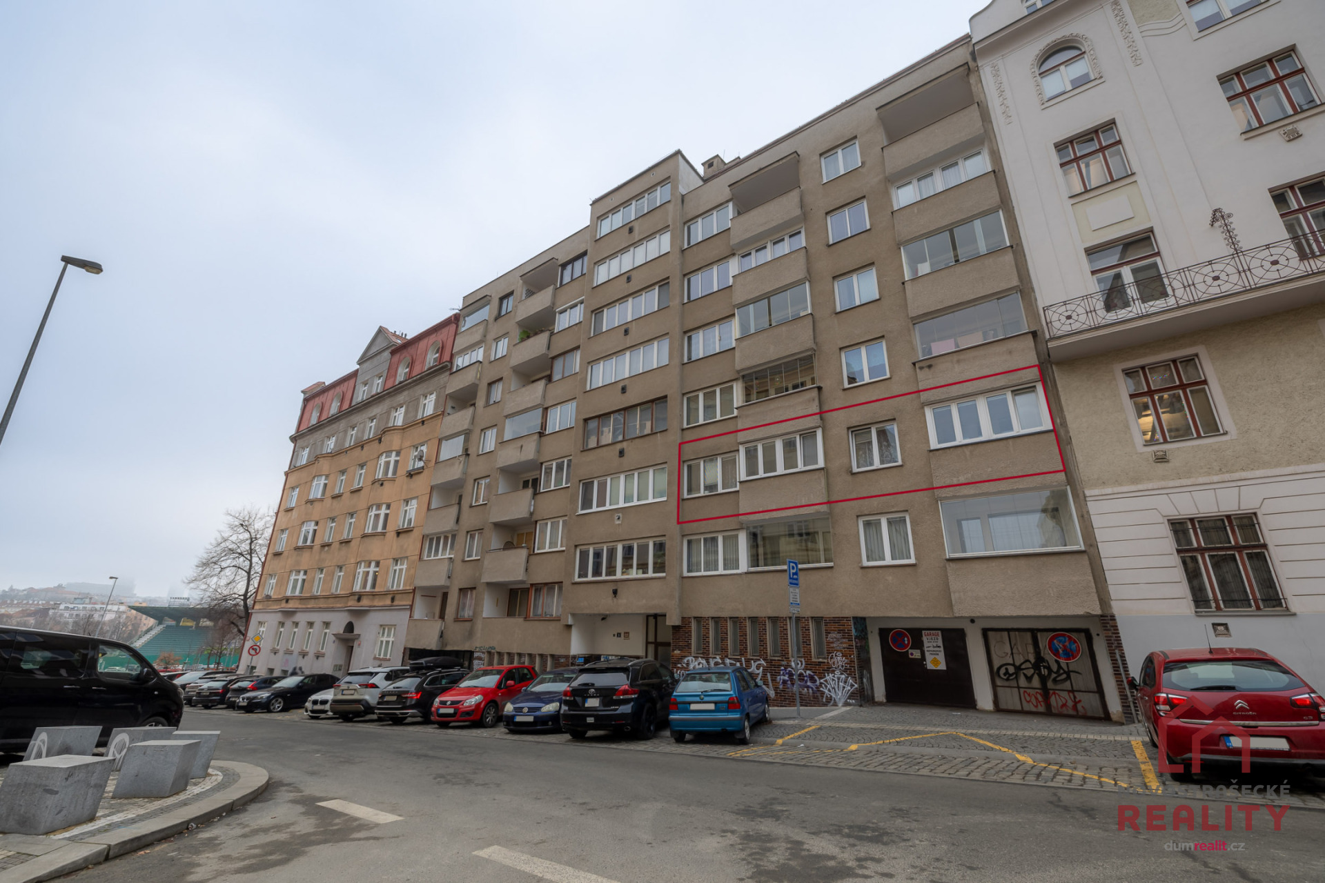 stadionu Bohemians, ale je v klidné ulici, kde není problém vždy zaparkovat. Na tramvaj cca